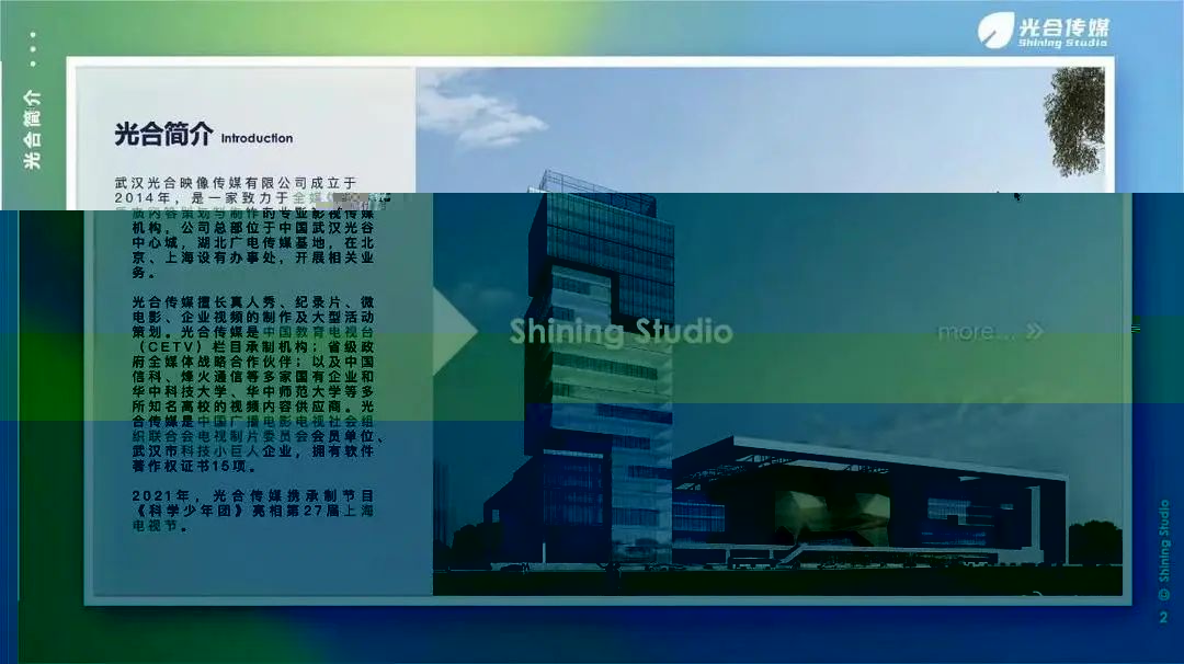 武漢光合映像傳媒有限公司成立于2014年,是一家緻力于全媒體優質内容策劃與制作的專業影視傳媒機構。光合傳媒持續高效創作優質影視内容,擅長真人秀、紀錄片、微電影、企業視頻的制作及大型活動策劃。